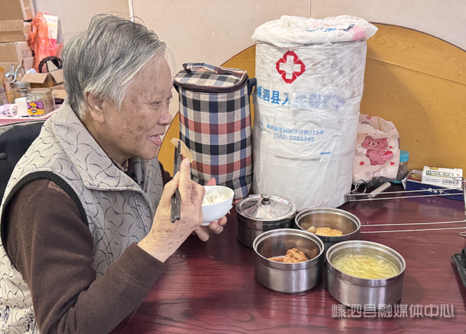 十点钟,送餐员准时出发,将装有“一荤一素一汤一饭”的暖心午餐挨家挨户送到老人手中。“食堂的饭菜都做得蛮好的,份量也多。而且菜品也经常换花样,鱼、肉、菜全都有。对我们老年人来说真的很方便。”家住东海路的独居老人王阿婆接过热气腾腾的午餐,脸上洋溢着幸福的笑容。