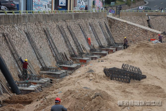 11月24日下午,记者探访施工现场时发现,距11月20日工程正式开工仅过去4天,各项基础施工已有序展开。沙滩后方海堤沿岸已开挖出一条长沟,沟内的多个水泥加固垫层上,工人们正专注进行钢筋铺设与焊接作业——这些结构将作为后续观光平台的立柱基础。一旁的挖掘机则同步开展沙子回填工作,为加固层做好周边防护,为下一阶段施工创造有利条件。