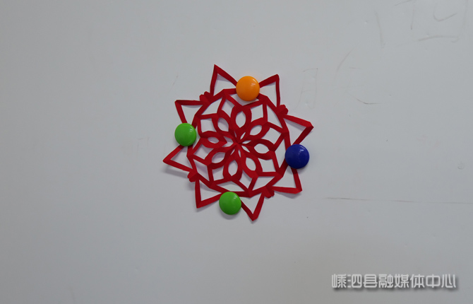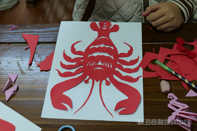 一番精心创作之后,一张张普通的彩纸经由孩子们的双手,变成了精美的窗花和龙虾剪纸。活动最后,大家开心地举起自己的作品,合影留念。通过这堂课,孩子们沉浸式体验了传统剪纸艺术与嵊泗海岛文化的碰撞交融,在学习剪纸技法、传承非遗的同时,又进一步培养了家乡情怀。