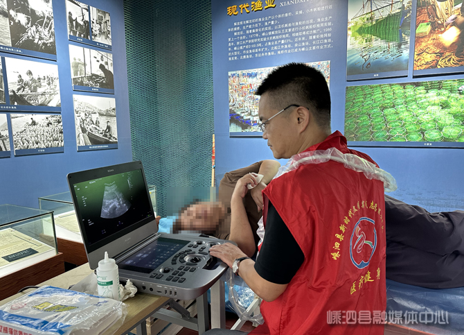 除了日常工作,孙俞峰还会带领团队前往嵊山、枸杞等小岛开展巡回医疗。在临时搭建的诊室里,他一边操作设备,一边耐心倾听、细心解答,用通俗易懂的语言让患者了解病情,缓解心理压力。居民董女士说:“刚去做了一下B超,没什么问题。这样的医疗服务对我们老百姓来说太好了,因为去菜园出行有点不方便。”