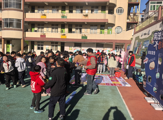 学生们在班主任带领下有序签到领取“宪法游园参与券”。开场仪式上,德育处主任通俗解读国家宪法日设立历程与宪法重要意义,法治副校长以“宪法离我们有多远”为题,结合校园实例解读宪法对未成年人受教育权、人身安全的保障,让抽象法律概念可感可知,赢得阵阵掌声。