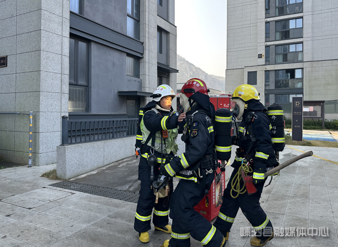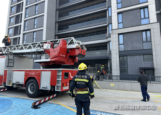 接到报警后,嵊泗县消防救援大队迅速调派救援力量赶赴现场,救援力量抵达后立即开展火情侦查。根据现场情况,灭火组依托消防设施铺设水带,深入“火场”内部阻截火势蔓延;搜救组在水枪掩护下,利用云梯消防车成功救出“被困人员”;举高喷射消防车在外围展开,对高层窗口“火势”进行压制。在各组协同配合下,“大火”被彻底扑灭。