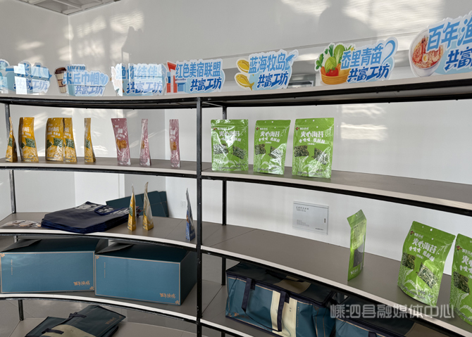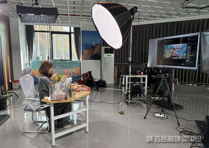 共富直播基地内,来自海宁皮革城的官方女主播虞薇正面对镜头展示嵊泗的特色产品,她身前的展示台上,本次的主推产品带鱼酥、黄鱼酥、海苔以及海鲜文创整齐排列。主播一边娴熟地介绍每款产品的特色和制作工艺,一边拿起带鱼酥现场试吃,细致地描述其独特风味,并不时与直播间的观众互动,及时解答他们的疑问。直播间人气高涨,吸引了超2000人次观看,促成了多单产品出售,让我县更多特色海产品通过直播“飞”往全国各地的消费者手中。