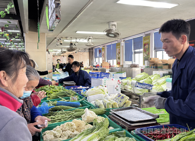 在县中心农贸市场二楼的“菜篮子”惠民店内,一派热闹繁忙的景象:翠绿的菠菜、鲜嫩的白菜、饱满的萝卜整齐码放,各类应季蔬菜色泽鲜亮、品类丰富;市民们提着购物袋穿梭在菜品间,仔细挑选心仪的食材,称重台前不时排起小队伍,购销两旺的氛围浓厚。销售人员则马不停蹄地往返于库房与货架之间,将成箱的新鲜蔬菜拆封、分拣、补货,确保货品始终充盈。