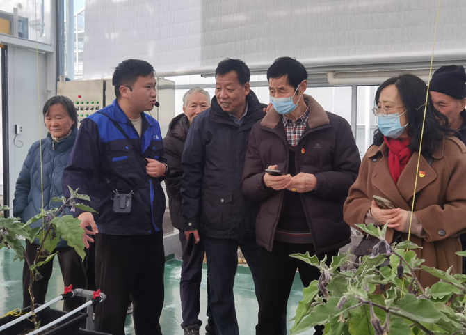 在“岙里青苗”共富工坊,党员们考察了舟山规模最大的单体玻璃温室项目。一踏入温室,整齐排列的栽培架、鲜嫩饱满的各类作物让人眼前一亮。工坊工作人员向党员们详细介绍了无土栽培、水肥一体化、生长环境实时监测、物联网智能调控等先进技术,以及湿帘、风机、内遮阳、内增温等配套设施的应用。此外,产业园还针对性地设计了采摘车轨道,专门解决温室内采摘、打叶机械的运输与移动难题。参观过程中,党员们认真聆听讲解,不时驻足细致观察,主动向工作人员询问种植品种、技术细节等相关问题,现场交流氛围十分热烈。