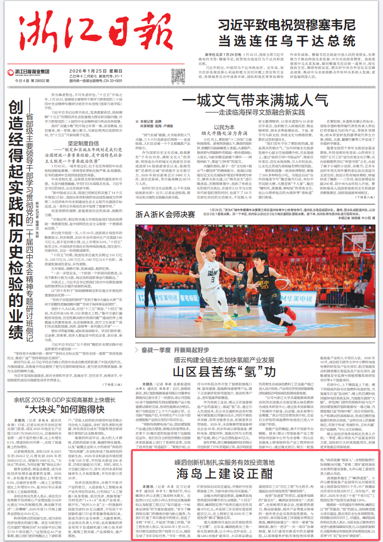 隆冬时节,舟山嵊泗小洋山北侧工地却热火朝天。总投资513亿元的小洋山北作业区集装箱码头及配套工程正以“每月建设一个标准足球场”的节奏加速成形。“多亏了嵊泗相关部门的精准对接与贴心服务,为我们打通了项目推进中的堵点,创造了全程‘不停工、不延误’的施工环境。”该工程负责人表示,仅2025年1至10月,项目便完成固定资产投资31亿元,提前完成了当年目标任务。“今年一季度,我们将加快启动东区建设,并做好中区前期准备工作,为新年新目标夯实基础。”