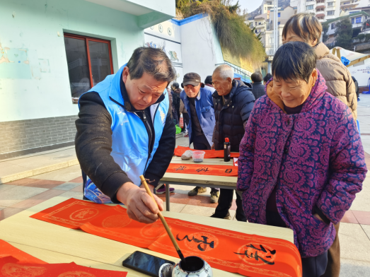 活动现场还设立了志愿服务摊位,吸引了众多居民的参与。摊位上,志愿者们为居民提供免费理发、泡脚、磨刀、测血糖、量血压等服务,为他们带来了实实在在的便利。修脚活动区前很是热闹,老人们一排排坐在椅子上,一边享用刚刚领来的热粥,一边就着药水泡脚驱寒暖身,让大家在寒冷的冬日里感受到了温暖与关爱。最受欢迎的还是派送春联的摊位,居民们在长桌前排起了长队,志愿者现场书写寓意吉祥的福字和新春对联,向居民传递对新一年的美好祝愿。