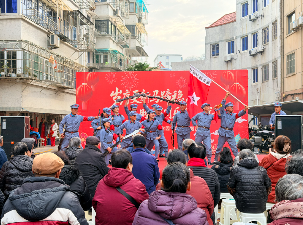 文艺演出在情景表演《长征组歌》恢宏的气势中拉开帷幕,演员们用真挚的情感、饱满的唱腔再现革命岁月的峥嵘,引得台下掌声阵阵。随后,经典越剧《蝶恋花》婉转登场,细腻的唱腔将传统戏曲的韵味展现得淋漓尽致,让戏迷朋友们过足戏瘾。最具海岛特色的嵊泗渔歌《东西南北风》更是唱出了渔家儿女的豪迈与柔情,熟悉的旋律勾起了老一辈人的共同记忆,不少居民跟着轻声哼唱。表演间隙穿插的嵊泗海岛年味民俗有奖知识问答,成为全场互动亮点。“嵊泗正月初一早餐常吃桂圆年糕汤,年糕的‘糕’谐音寓意是什么?”“嵊泗人春节吃年糕时,通常会搭配什么海鲜食材,寓意‘年年有余、步步高升’双重美好?”一道道贴合本地年味的题目,既激起了在场观众的参与热情,也在问答互动中普及了“祭灶、掸尘、送年”等嵊泗海岛传统年俗。最后,大合唱《今天是你的生日》以激昂的旋律将现场气氛推向高潮,演员与居民齐声高歌,爱国情怀与邻里温情在歌声中传递。