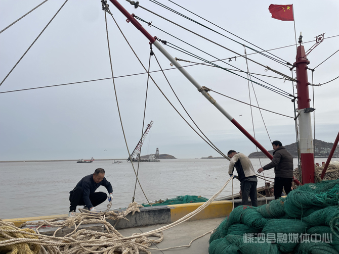 2月26日上午,嵊泗县中心渔港南港区一派繁忙景象。渔船发动机的轰鸣声与渔民的呼喊声交织共鸣。港口内,一艘艘渔船有序进出;码头上,运输车辆穿梭往来,将成捆的网具运抵船边。甲板上,渔民们熟练地操作起网机和桅杆,将渔网归舱整理,缆绳、浮标等作业工具堆叠有序。与此同时,不时有渔民拎着饮用水、食用油等生活物资登上渔船。在部分即将出海的渔船上,渔嫂们在甲板上飞针走线,抓紧最后的时间修补网具,为新一轮捕捞作业做好充分准备。“网具已经修补整理完毕,冰块和燃油也准备好了,准备工作都已就绪,明天出海。”船老大俞艳东一边检查网具一边说道,“新的一年,希望生意兴隆,咱们渔民兄弟辛苦出海,都能多挣点钱,有个好收成。”