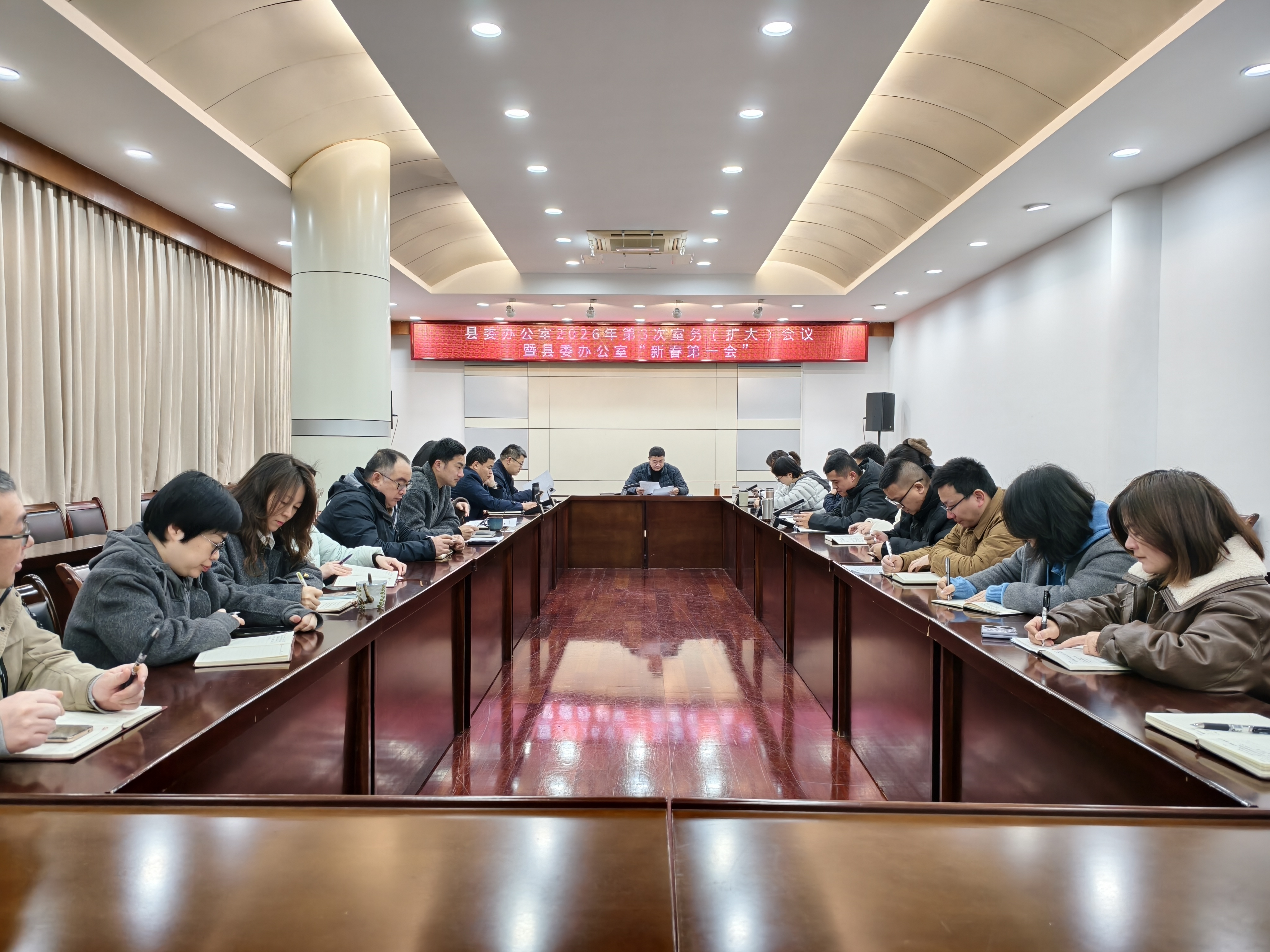 2月27日上午,县委办召开2026年第3次室务(扩大)会议暨“新春第一会”,传达学习省、市、县“新春第一会”精神,研究部署贯彻落实举措。县委办主任洪光裕主持会议并讲话,相关科室作交流发言。