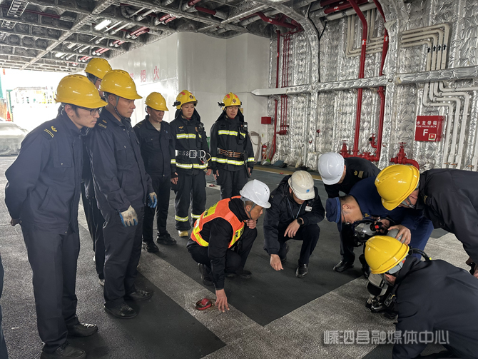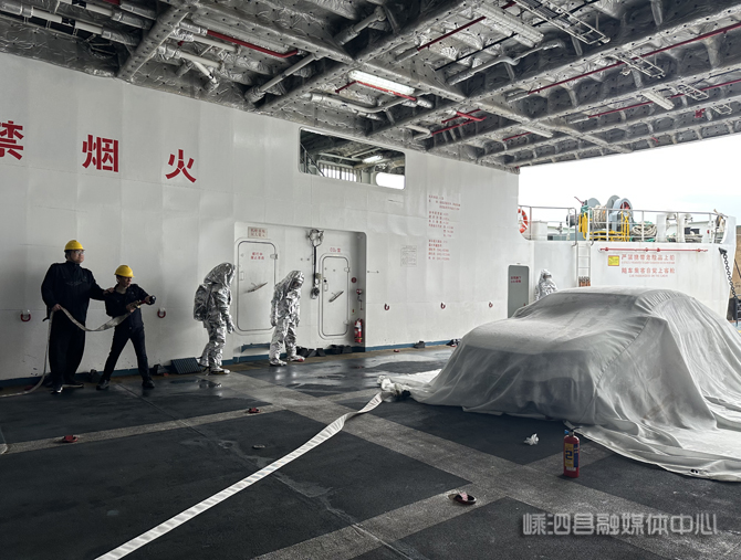 随后,联合检查组组织开展车辆甲板新能源汽车着火专项消防实战演练,模拟车辆甲板车辆自燃引发火灾的突发场景。船舶船员第一时间启动火灾应急预案,迅速发布火警警报,海事执法人员与消防救援人员现场协同指挥,指导船员开展初期火灾扑救、火势控制、人员搜救等实操环节,严格按照船舶火灾应急处置流程展开演练。