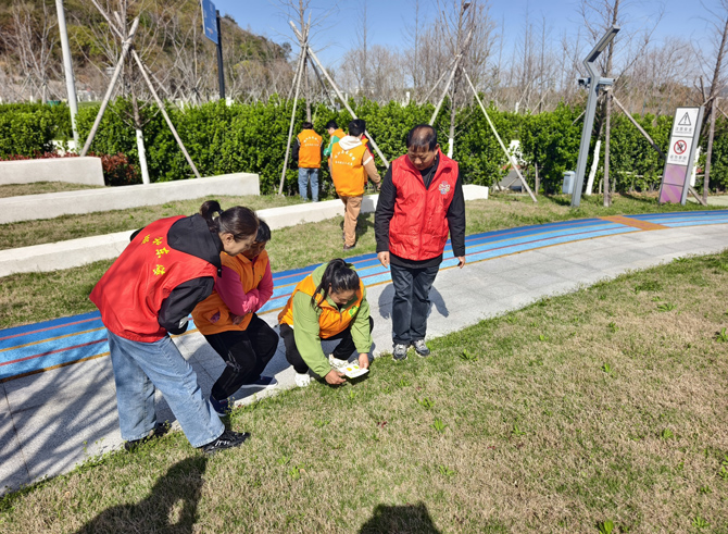 “寻色找自然”,主持人让大家抽签随机分成两人一组,强调组员要互相配合完成本组的任务,各组带着随机抽到的四色色卡,化身“自然小侦探”,在公园绿植间开启色彩探索。志愿者全程陪伴引导,“阳光宝宝”们两两结伴,蹲在草坪、灌木丛中,认真搜寻与色卡匹配的花叶:深绿的枸骨叶、嫩黄的蒲公英、奶白的三叶草花、金灿灿的油菜花。他们将抽象色彩变成触手可及的春日生机。