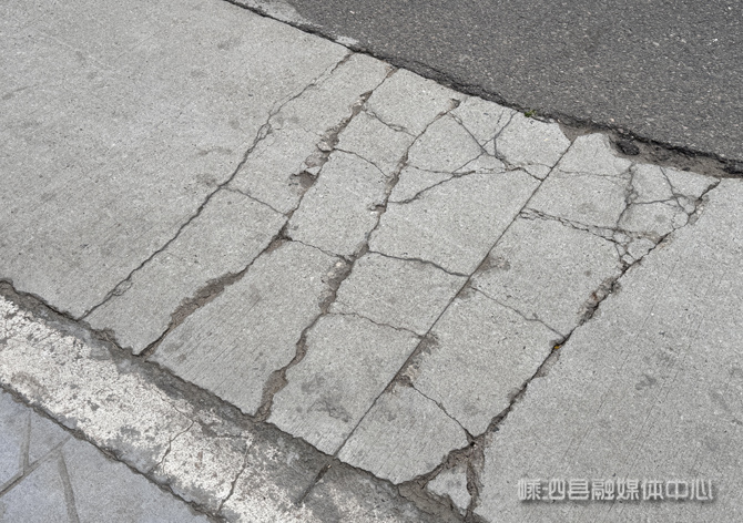 在现场记者发现,该路段最显眼的就是“黑白分明”的路面——一半是黑色沥青路面,一半是灰色水泥路面。其中,水泥路面的破损情况尤为严重,路面上布满网状的裂缝,部分路面板块甚至发生断裂、翘起,与周边路面形成明显高差。车辆经过时颠簸感强烈,存在不小安全隐患。“路面坑坑洼洼,电瓶车开快一点就很危险,我们特别希望这条路能尽快修好,平安出行才是最重要的。”市民刘女士在接受采访时说道。