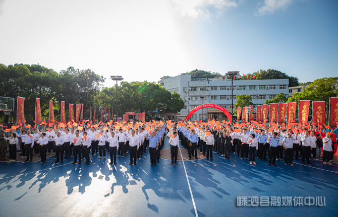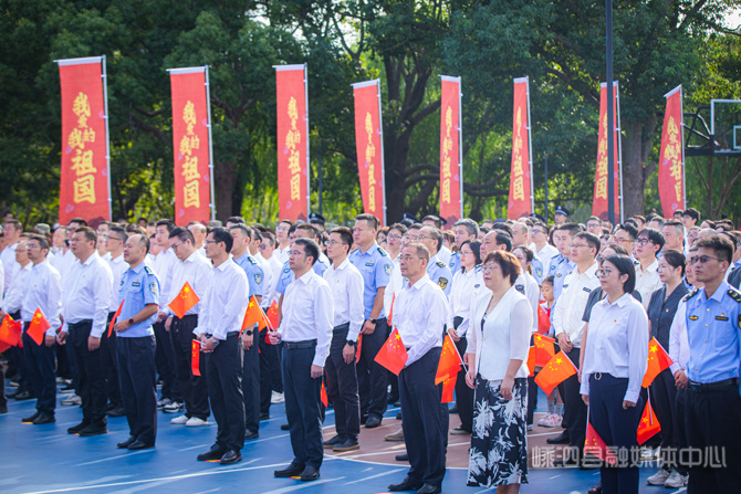 活动现场,县四套班子领导,县属各单位、省市属在嵊单位机关干部、菜园镇机关干部、社区干部,党员代表、群众代表、学生代表以及驻嵊部队代表一同参加升国旗仪式。