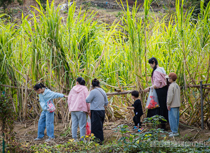 旁边的甘蔗田,则成了力量的考验场。在爸爸妈妈的协助下,孩子们举起砍刀,瞄准根部,用力一挥——“咔嚓”!甘蔗应声倒地。卢静妤兴奋地扛起自己的“战利品”,长长的甘蔗在身后一摇一晃。她保持着平衡,把甘蔗运到加工点。刚一拿到处理好的甘蔗,她就迫不及待地啃上一口,随即宣布:“自己砍的甘蔗,就是甜!”