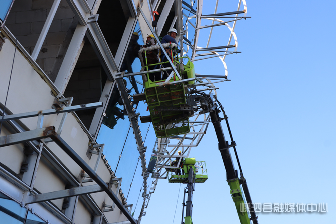 项目北区施工现场机械配合、人员协同,一派繁忙有序的建设图景。施工人员各司其职,高效完成搬运加工作业,同时搭乘施工车辆,同步推进幕墙玻璃与顶部骨架安装。这座三层结构的客运中心,还将通过廊桥与小菜园码头直连,未来游客下船后可经廊桥直达客运中心换乘陆上交通工具,出行动线更清晰、换乘体验更便捷。