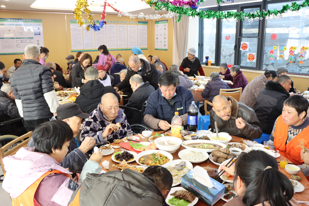 餐厅里,彩带缠绕、窗花点缀,老人们亲手制作的手工作品错落其间。后厨里,锅铲碰撞的清脆声响此起彼伏,贻贝、鲳鱼、皮皮虾等鲜肥海鲜摆满备菜区。很快,饭菜的鲜香便飘进了餐厅。