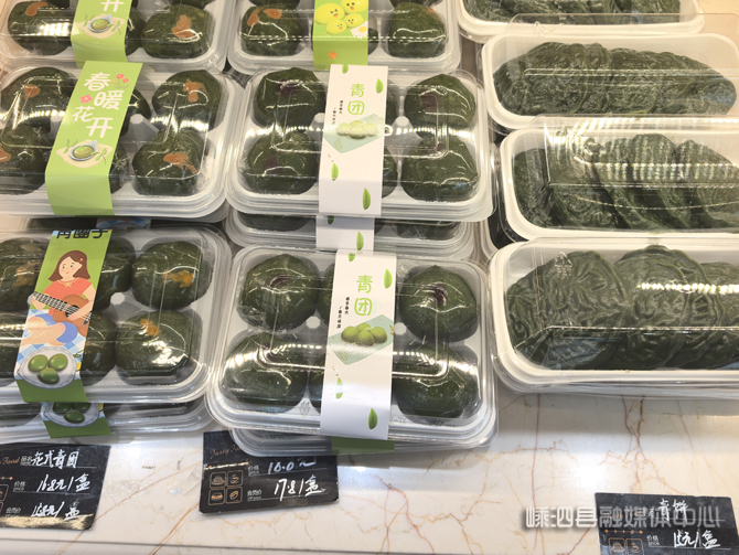 在本地多家商超,青饼制作原材料被摆放在中心货架的核心位置,商家以优惠价格进行销售,满足市民自制青饼的需求。与商超主打原材料销售不同,蛋糕店则早在3月初就推出了成品青饼、青团,目前在售的口味涵盖豆沙、黄豆粉、肉松、无馅四种经典款式。