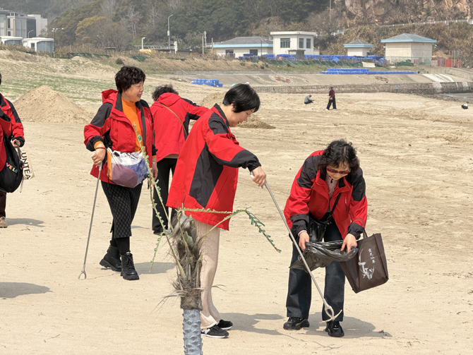 由于4月正值羊栖菜生长采收期,沙滩上遍布一堆堆黑色的羊栖菜,加之游客遗留垃圾,既影响沙滩整洁美观,也对海洋生态环境造成一定影响。学员们手持夹子、垃圾袋等工具,分工协作、干劲十足,全身心投入到沙滩清洁工作中。大家弯腰俯身,细致清理沙滩上的羊栖菜、塑料垃圾、废弃杂物、烟头纸屑,虽然年岁已高,但大家热情丝毫不减,现场一片热火朝天的忙碌景象,“志愿红”的身影与蔚蓝的海水、金黄的沙滩相映成趣,成为海岸边最动人的画面。